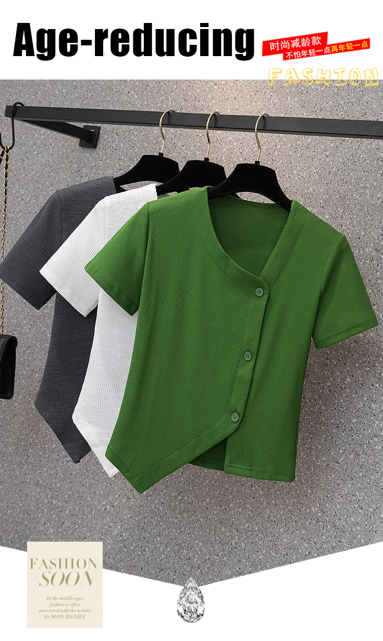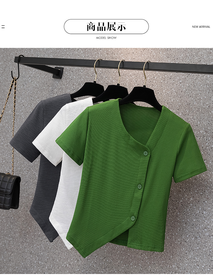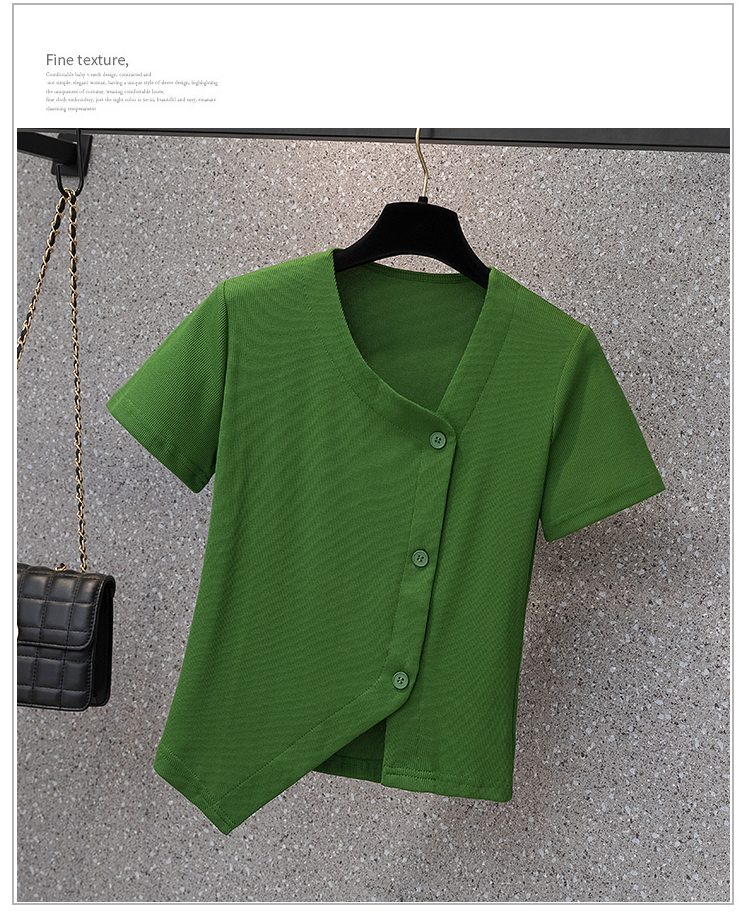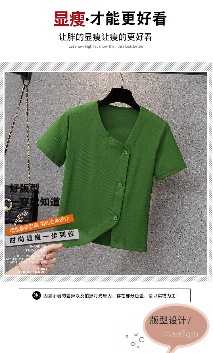 胖mm不規(guī)則短袖上衣2022年夏新款大碼女裝法式V領(lǐng)純色百搭T恤衫潮