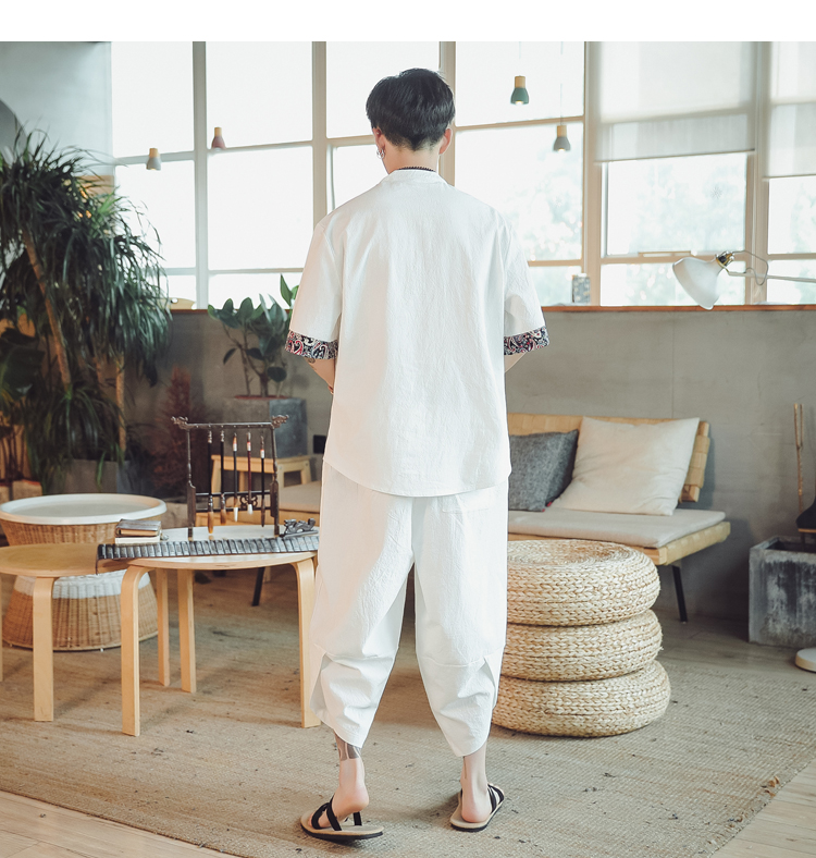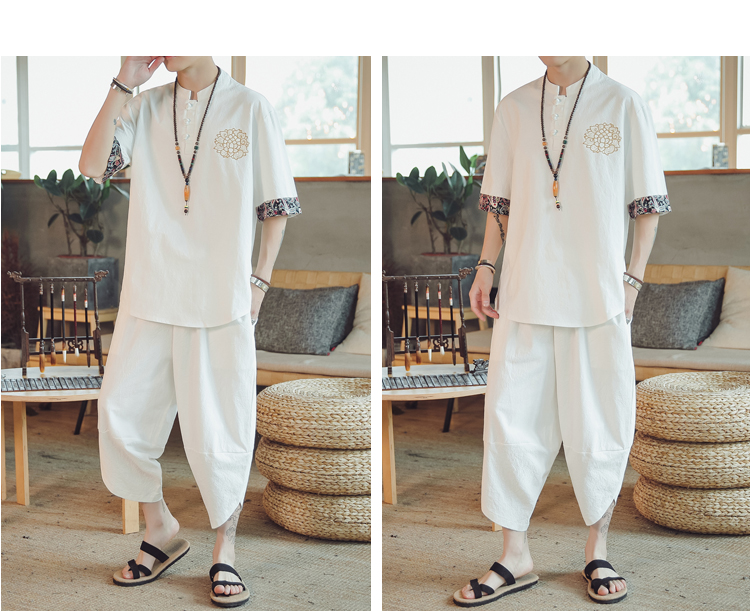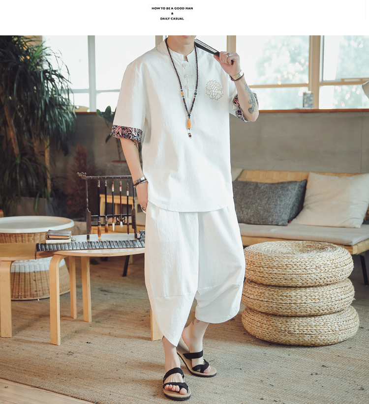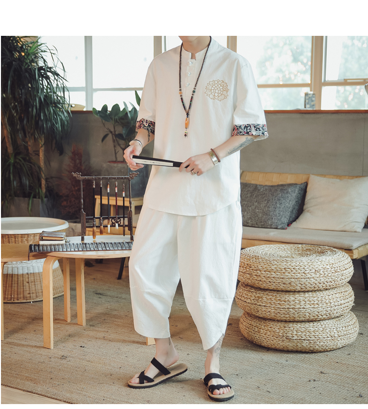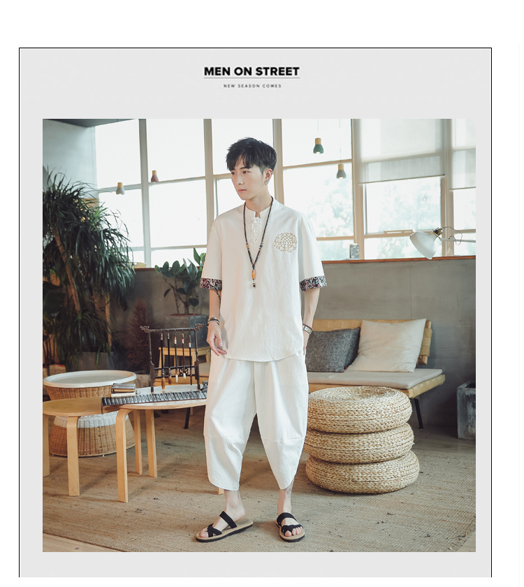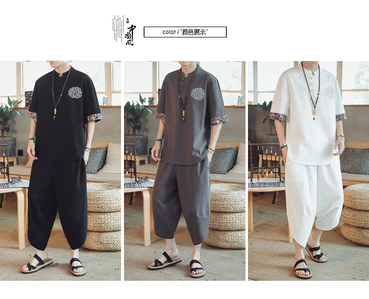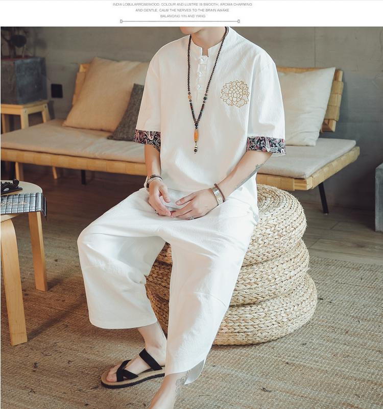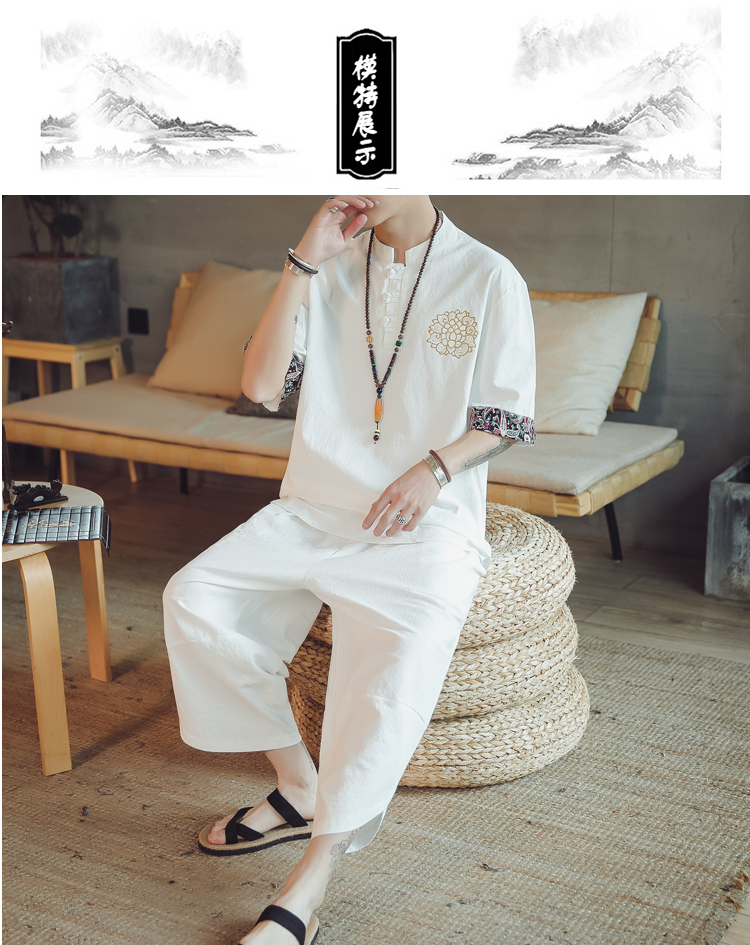 亞麻t恤男短袖夏季寬松刺繡上衣唐裝潮流中國風男裝棉麻半袖套裝